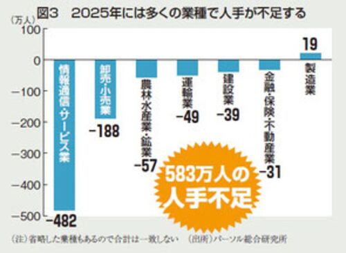 上の図は、特集「人材不足ですが何か?」(「週刊エコノミスト」2017年4月18日号)から拝借いたしました。 2025年には多くの業種で致命的な人材不足に陥るよ、ということで、 突出している「情報通信・サービス系」はこれから成長する業種なので、慢性的な人…